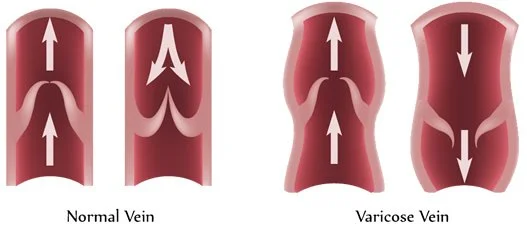 When these valves become “faulty or damaged”, they are called incompetent valves and the blood now flows in both directions (reflux) thereby causing pooling. This condition is called venous insufficiency. This pooling of blood in the leg veins over a period of time causes the veins to bulge and protrude from the skin surface.